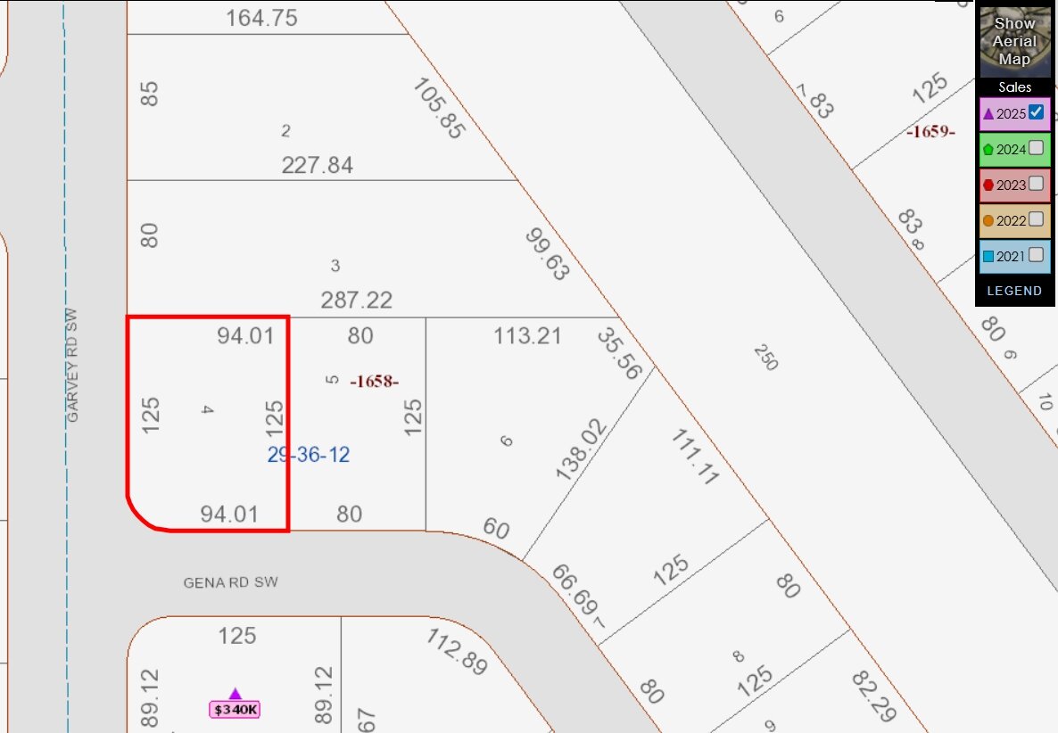 Corner lot in an already developed area. Corner of Garvey and Gena Rds SW. Well and septic.